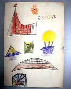 '70」の「E」を間違えている ほど、気合いが抜けておるようです。 この絵を見ると、当時気に入ってたのは、アメリカ館、サントリー館